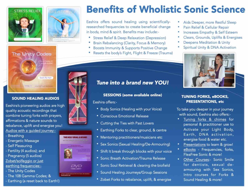 Eeshira is passionate about empowering clients to become their own healers using the power of scientifically-researched and medically applied sound healing frequencies and those that are based on the laws of Nature and the Universe combined with the breath, the power of the voice, movement, body wisdom, light, sacred geometry & consciousness.
