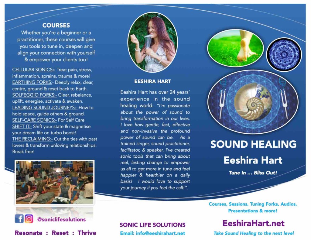 Eeshira Hart has been a health and wellness practitioner since 1991 and has over 22 years’ experience in the sound healing world with a certificate in Tuning Fork therapy from the Institute of Cyberkinetics, UK and a Certificate in Psycho-Acoustics (the scientific term for sound healing) from the Globe Sound & Consciousness Institute, USA where she has subsequently taught the Institute’s students online. She has trained widely with other experts in the sound healing field e.g. Jonathan Goldman, John Beaulieu (the father of tuning fork therapy), Randy Masters, Chloe Goodchild and more! She also holds ITEC diplomas in Holistic Massage, Aromatherapy, Indian Head Massage, Sports Massage and a Diploma in Reflexology (IIHHT) and has trained in Hyperton-X Trauma Release Bodywork, Rebirthing and Biodynamic Breathwork Trauma Release.